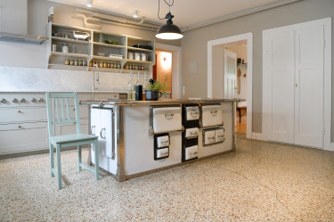 Im unteren Stockwerk findet sich eine großzügige Küche und zwei Esszimmer für gemeinsames Speisen und Beisammensitzen.