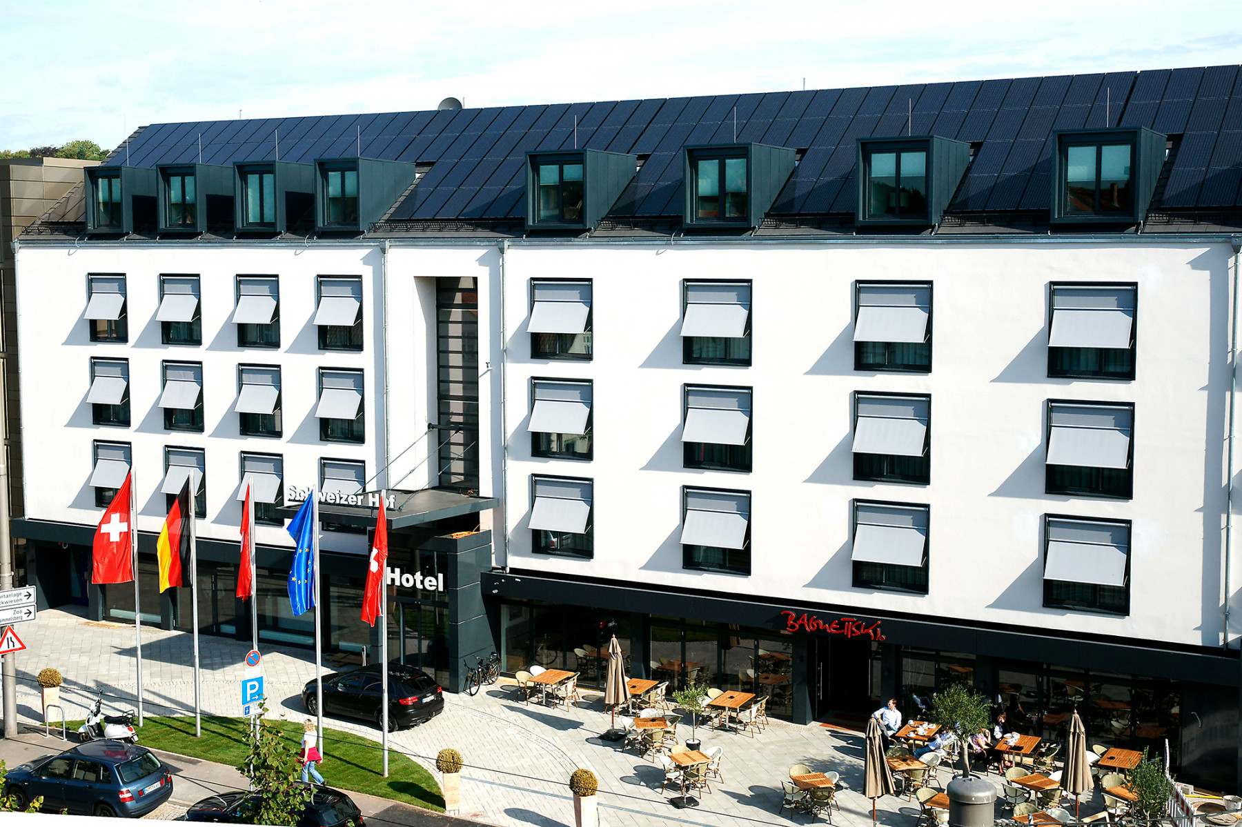 Schon seit Anfang 2011 verfügt der Schweizer Hof über eine große PV-Anlage, die mindestens 23.000 kWh jährlich erzeugt. Durch die Einspeisung ins öffentliche Stromnetz trägt das Hotel dazu bei, die Klimabilanz der Stadt Kassel zu verbessern.