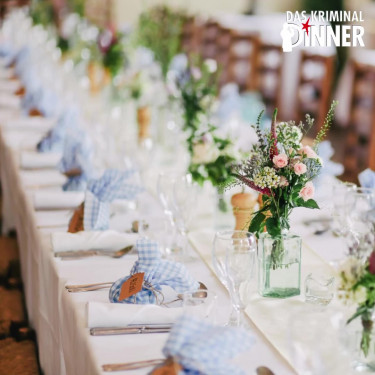 Ein genüsslich inszenierter Mordfall, bei dem die Szenen jeweils zwischen den Gängen „serviert“ werden. Zuvor werden Ihre Gäste durch Walk-Acts – Butler und Dienstmädchen – in Empfang genommen und zu Tisch geführt. Insgesamt dauert das abwechslungsreiche Programm inklusive Essen etwa drei bis dreieinhalb Stunden, wovon rund 80 Minuten reine Spiel- und Ermittlungszeit sind. Übrigens können Sie bei der Planung zwischen zwei Krimi-Themen auswählen.